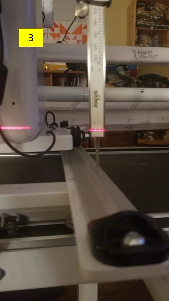 I lowered the foot at this frame location by 1/2 turn, and the beam re-centered on the target, the frame was level AND flat, and the Free Motion Quilter will be delighted as the next quilt gets loaded. The key here is the 1mm "hump" occurred very quickly - within a foot - to the "flatness" of the rest of the frame which allowed it to be felt by a sensitive Free Motion Quilter. If it occurred on a more gentle slope over a longer distance it likely would not be detected by the longarmer.